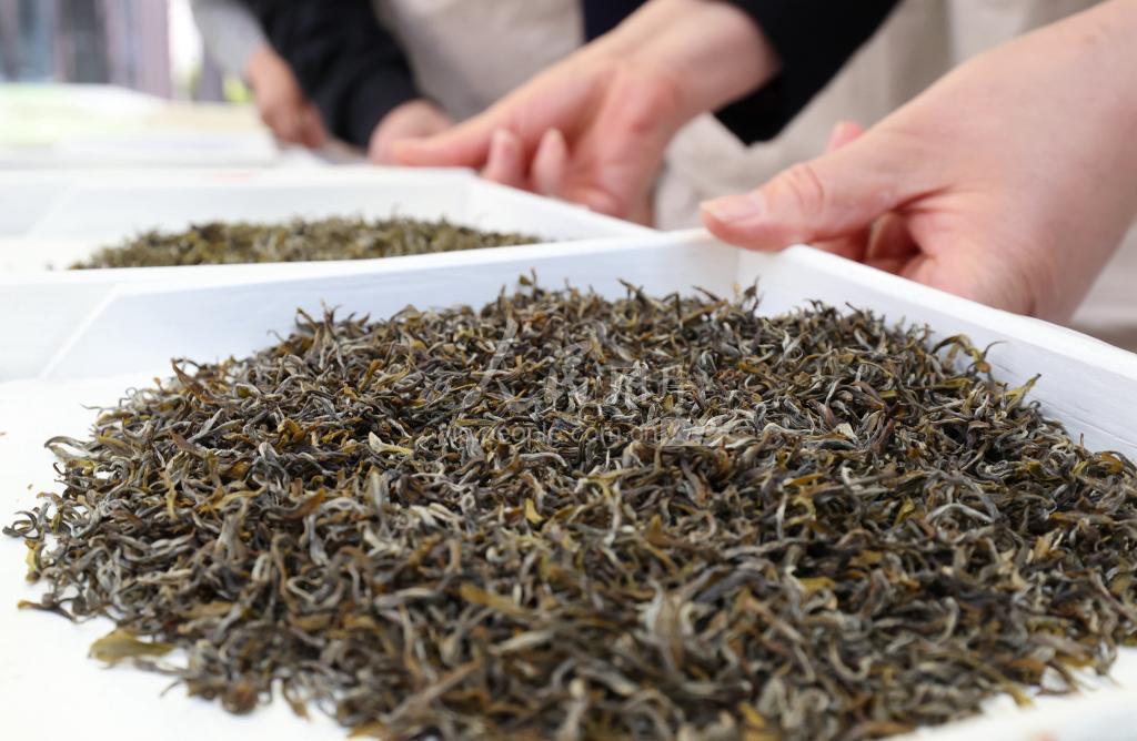 2022年5月14日,在浙江省湖州市德清县“莫干黄芽”茶王赛现场,专家将茶叶分置茶盘中,准备进行评审。