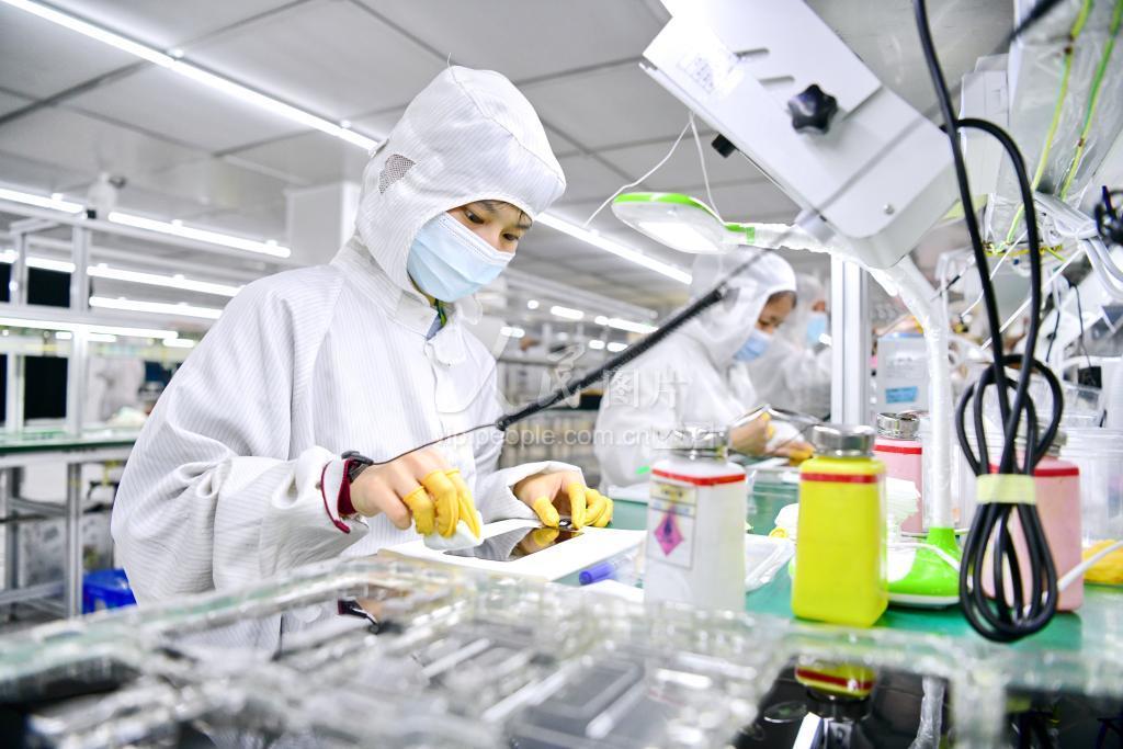 2022年5月13日,江西省赣州经济技术开发区赣州综合保税区的一家电子产品生产企业,工人在智能化生产线上加工出口国外的5G手机显示屏。 江西省赣州经开区按照粤港澳大湾区数字经济发展需求,开展延链、补链、强链招商,引进具有领先技术的产业链核心项目、关联项目电子企业200余家,围绕芯片、电子元器件、核心零部件、移动智能终端等细分领域,构建起“芯——屏——端——网——器”中高端电子产业体系。