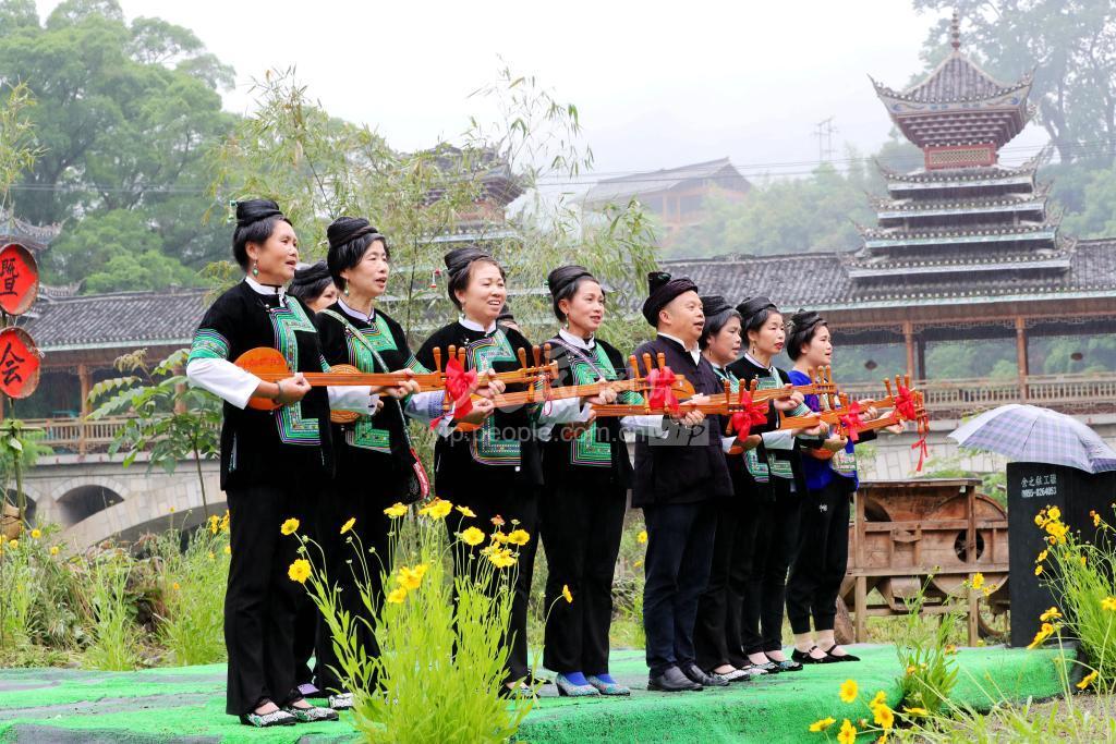 2022年5月14日,在贵州省黔东南苗族侗族自治州榕江县寨蒿镇乌公村乌公侗寨,侗族群众在竹米节弹唱侗族琵琶歌。