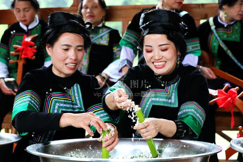 2022年5月14日,在贵州省黔东南苗族侗族自治州 榕江县寨蒿镇乌公村乌公侗寨,侗族村民在制作竹米饭。