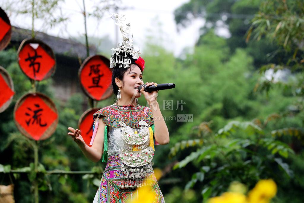 2022年5月14日,在贵州省黔东南苗族侗族自治州榕江县寨蒿镇乌公村乌公侗寨,侗族姑娘在竹米节演唱侗歌。