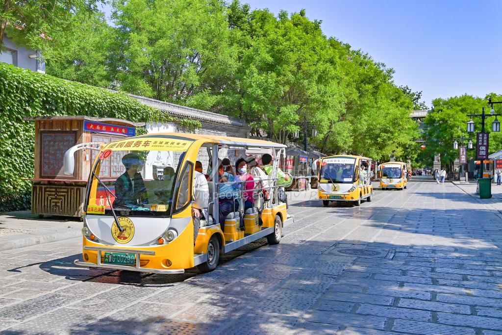 2022年5月15日,残疾人士乘坐观光车在山东省青州古城景区游览。