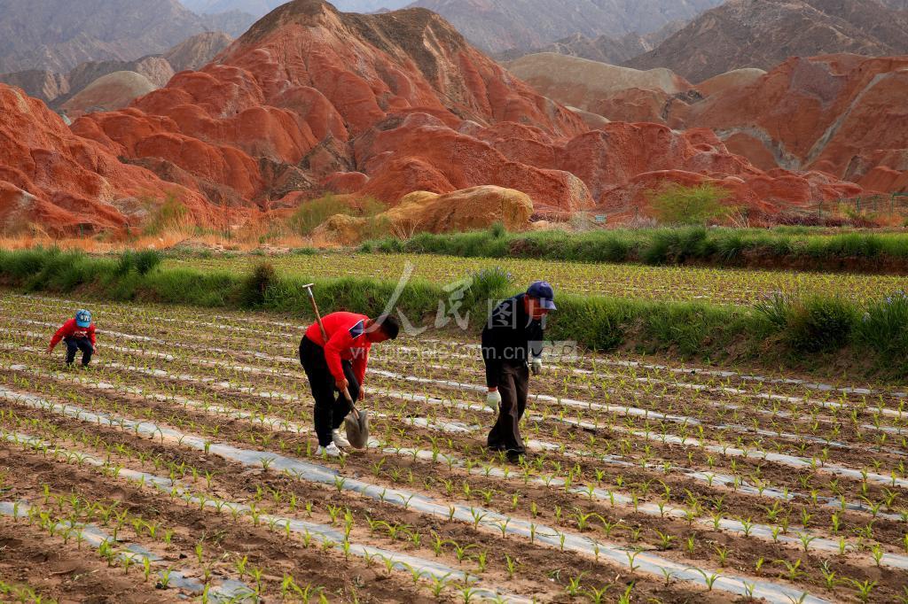 2022年5月14日,在七彩丹霞山下的甘肃省张掖市临泽县倪家营镇南台村玉米制种田野,两个小学生正跟随爷爷学习玉米制种间苗、除草作业。