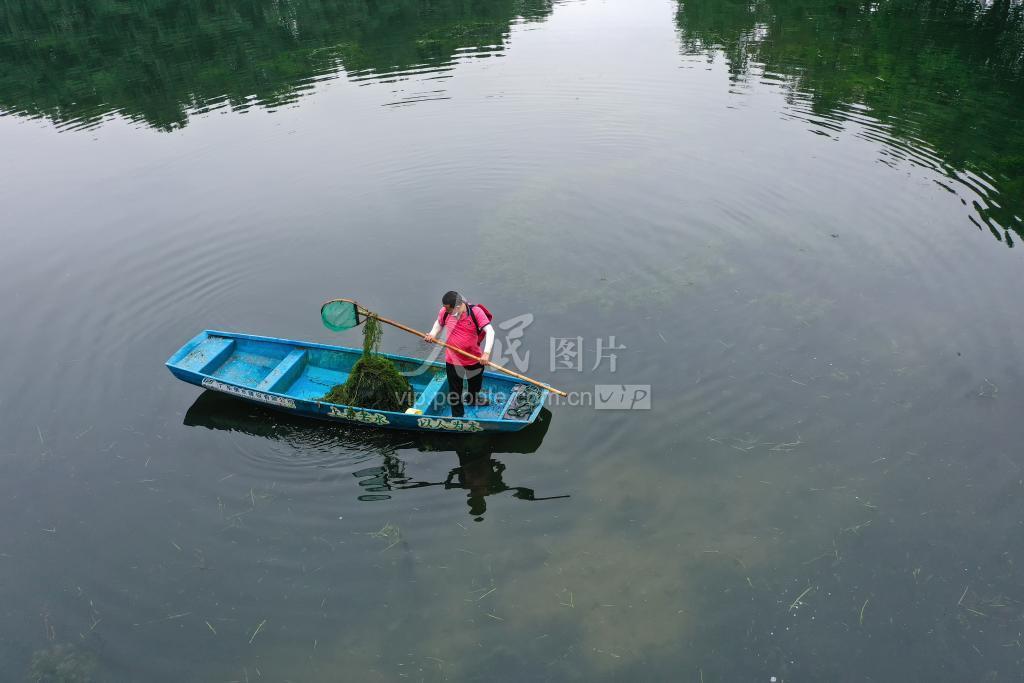 2022年5月14日,广东省佛山市禅城区,保洁人员正在清理亚艺公园生态湖里生长迅速的植物。 近年来,佛山市积极践行绿色发展理念,加强生态环境保护,打造了以生态、观花、亲水为特色的“七湖两湾一站一园”生态绿廊,成为市民休闲娱乐、健身的好去处。