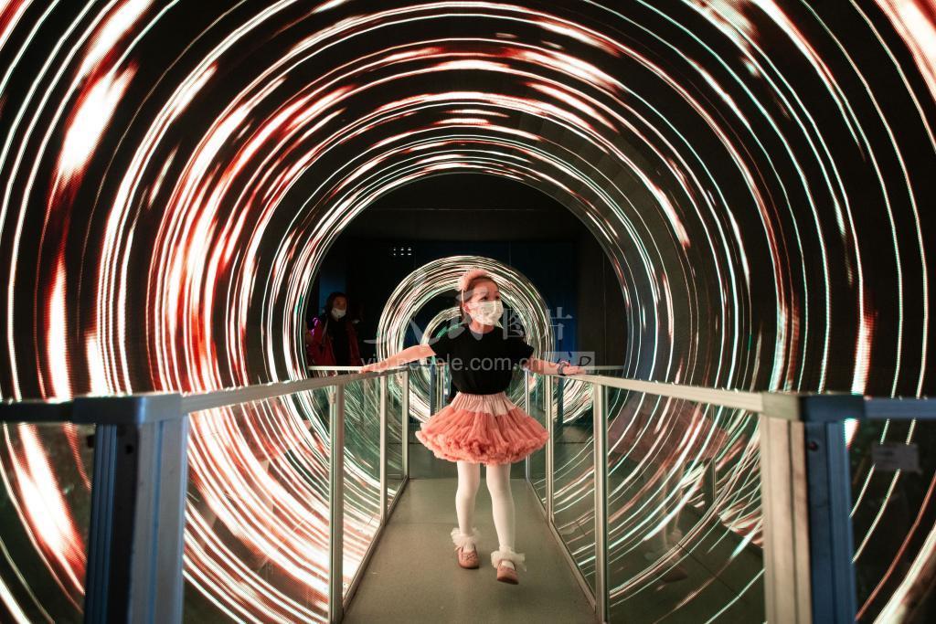上传时间: 2022-05-21 23:18:56 图片说明: 2022年5月21日,小朋友在南京科技馆的“眩光通道”里参观体验。
