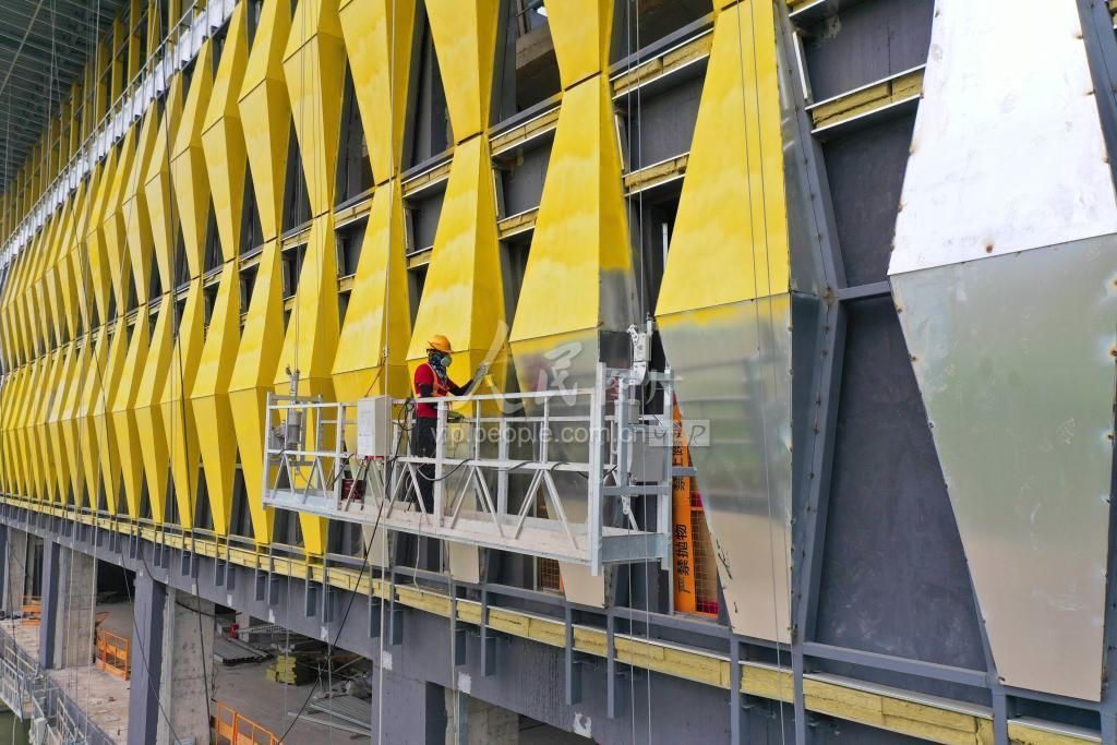 2022年5月21日,浙江省台州市域铁路S1线温岭段城南站,建设者在涂装车站外墙装饰板。 台州市域铁路S1线工程是国内首条采用PPP模式并落地的市域铁路项目,全长52.4公里,采用最新研发的动车组,设计时速每小时140公里,总投资约228亿元,计划今年6月30日前全线完工并试运行。近年来,温岭市加大交通基础设施投入,通过建设城市快速路、市域铁路等交通基础设施,提升通行能力,赋能乡村振兴,让群众出行更有获得感和幸福感。