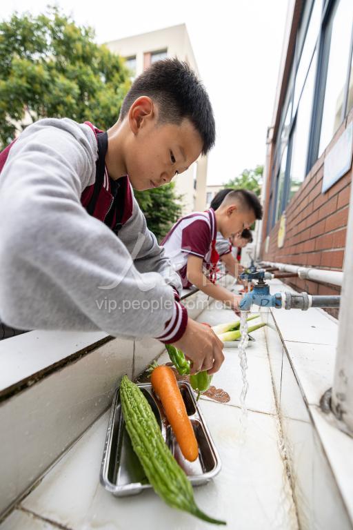 5月24日,学生在浙江省湖州市南太湖新区新风实验小学教育集团清河校区的烹饪课上备菜。