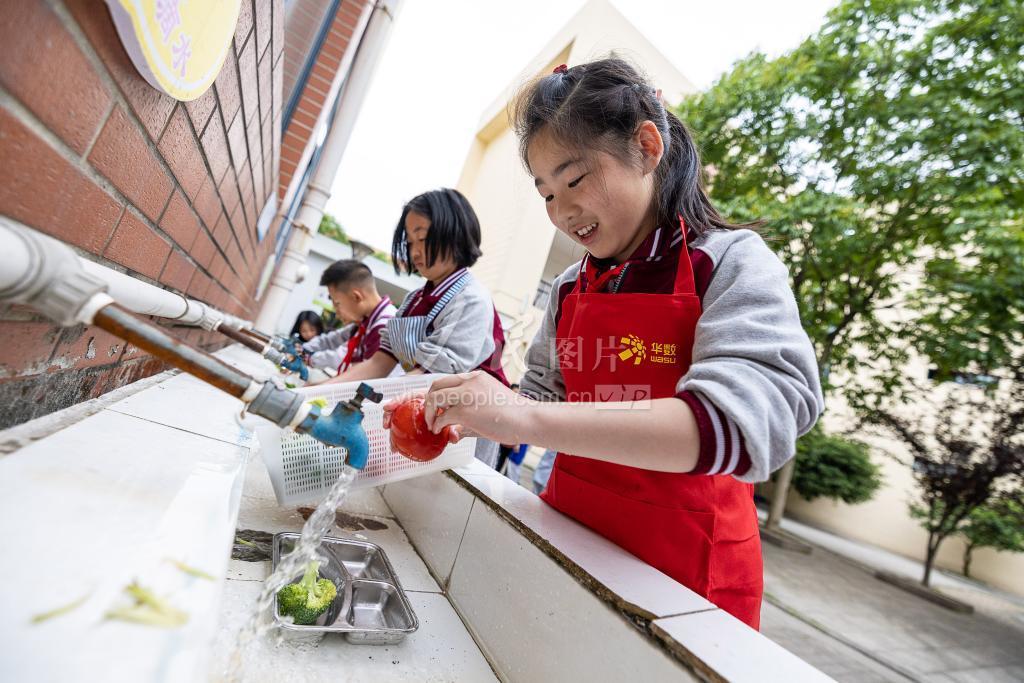 5月24日,学生在浙江省湖州市南太湖新区新风实验小学教育集团清河校区的烹饪课上备菜。