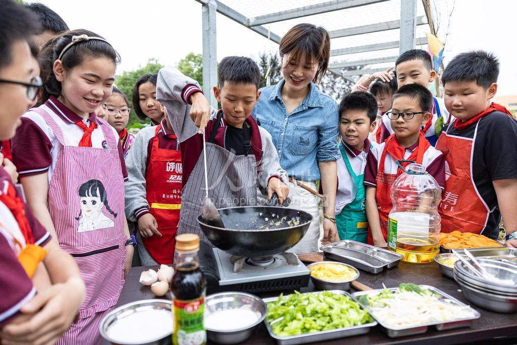 5月24日,在浙江省湖州市南太湖新区新风实验小学教育集团清河校区,学生在烹饪课老师的指导下练习制作西红柿炒蛋。