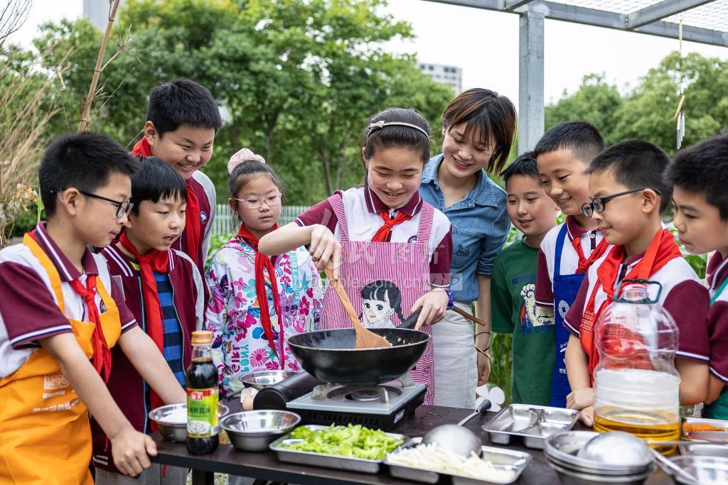 5月24日,在浙江省湖州市南太湖新区新风实验小学教育集团清河校区,学生在烹饪课老师的指导下练习制作西红柿炒蛋。