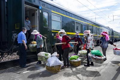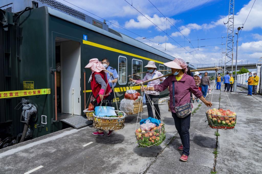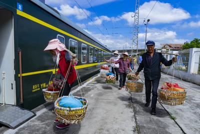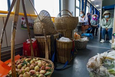 2022年6月4日,云南省曲靖市马龙火车站,沿线村民登上5652次列车,准备前往曲靖市售卖农产品。