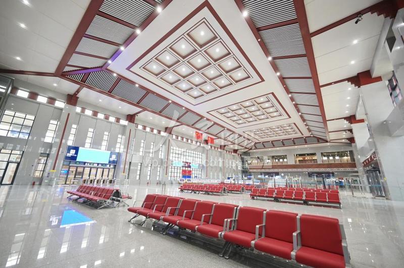2022年6月9日,滑浚站北站房候车大厅,柱头利用遏云楼雀替元素,实现了墙面与吊顶不同构件的巧妙过渡。