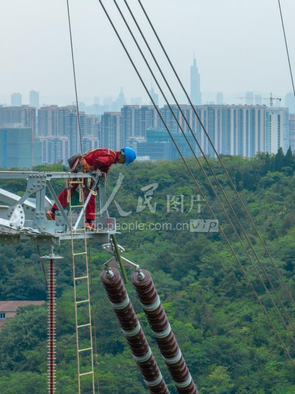6月23日,国网南京供电公司对南京青龙山500千伏输变电升压工程线路工程进行走线验收,工人正在高空检查施工工艺。