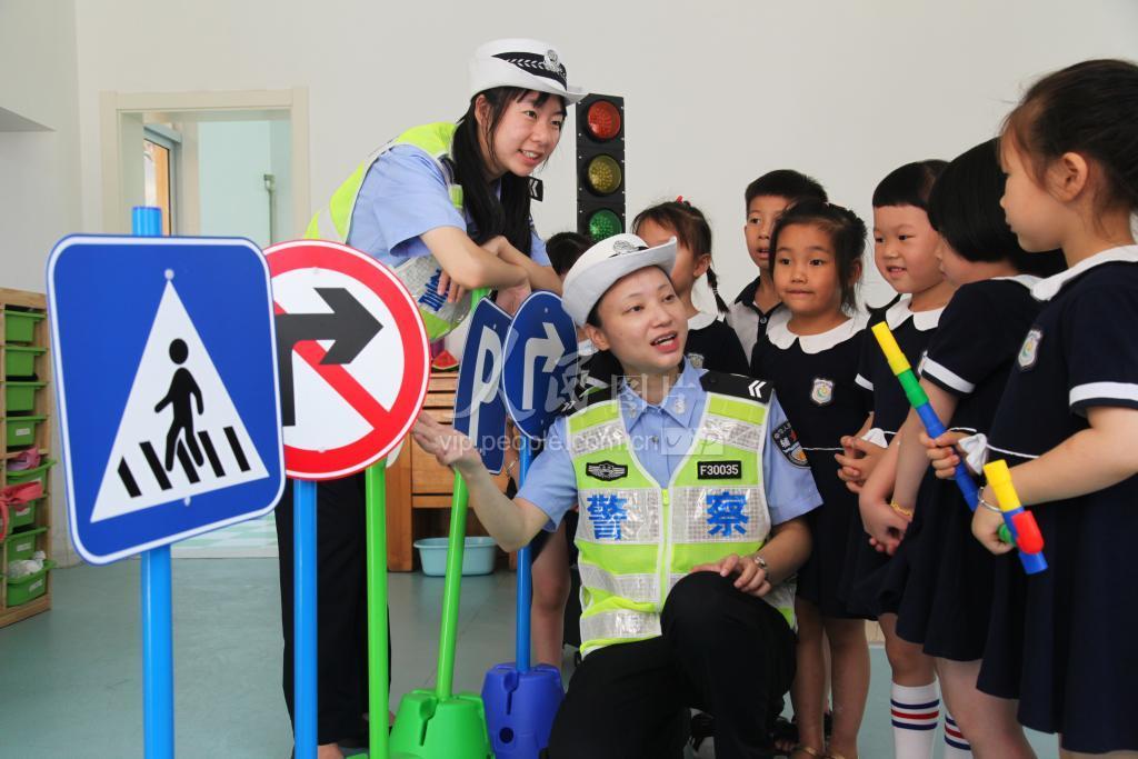 2022年6月23日,浙江省台州市路桥区蓬街镇交警在当地幼儿园向小朋友宣传交通安全。