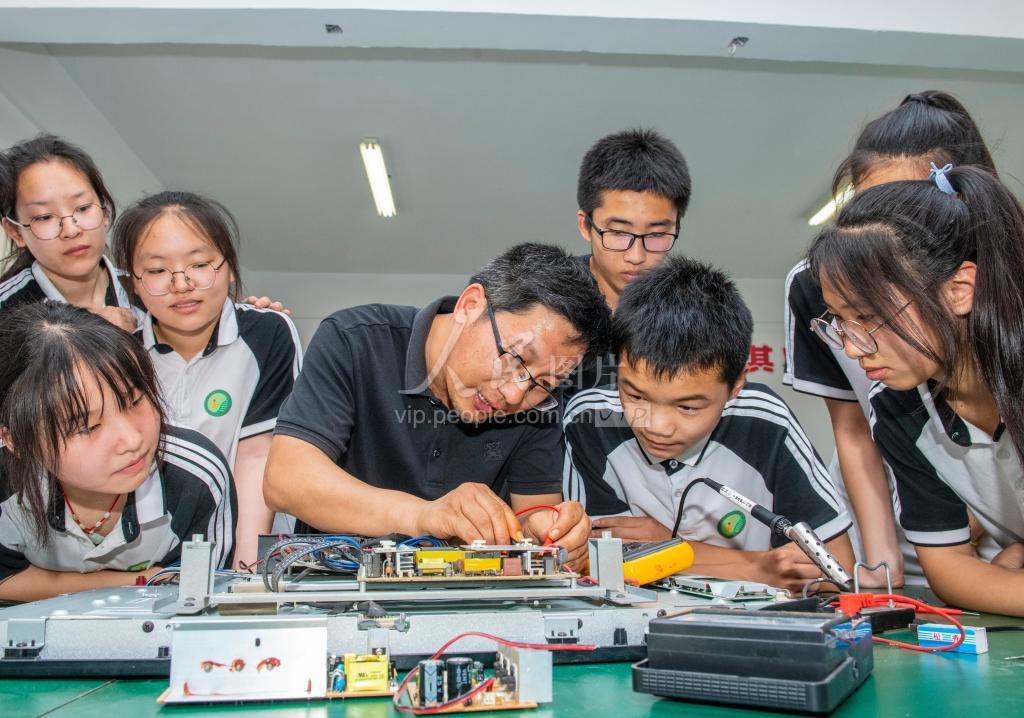 2022年6月21日,在江苏省宿迁市宿豫区第一初级中学,老师正在讲解维修电视机。 “双减”政策实施以来,江苏省宿迁市宿豫区常态组织学校学生开展形式多样、内容丰富的劳动实践活动,锻炼孩子动手、观察、学习等能力,培养他们热爱劳动、尊重劳动的优秀品质。