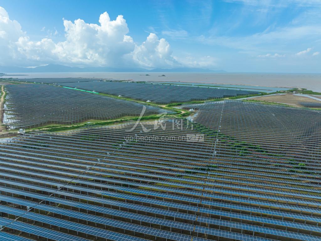 2022年6月22日,广东省台山市海宴镇南部临海的广东台山海宴镇500MWp渔业光伏发电项目俯瞰图。