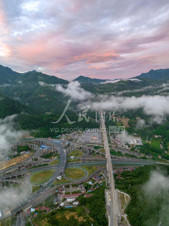 2022年6月23日,湖北省襄阳市保康县后坪镇,郑渝高铁和高速路网在空中立体交汇,并在云雾间若隐若现,蔚为壮观。