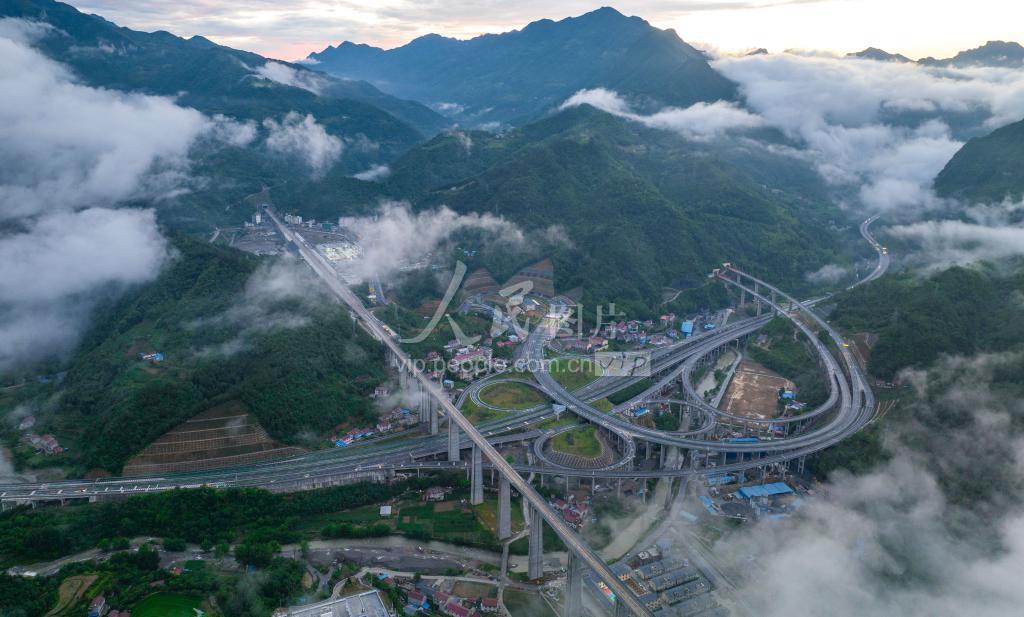2022年6月23日,湖北省襄阳市保康县后坪镇,郑渝高铁和高速路网在空中立体交汇,并在云雾间若隐若现,蔚为壮观。