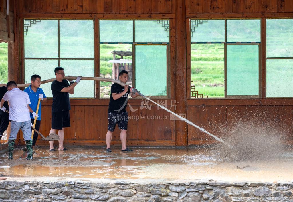 2022年6月24日,工作人员在贵州省从江县刚边壮族乡银平村受灾现场进行清淤工作。
