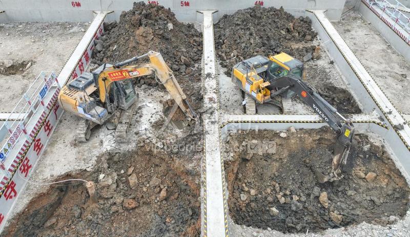 2022年6月24日,在位于浙江省湖州市德清县康乾街道的杭德市域铁路高铁站施工现场,工人在进行深基坑开挖作业。作为浙江省第一个批复的市域(郊)铁路项目和长三角地区“十四五”期间规划建设的市域(郊)铁路项目之一,杭德市域铁路全长25.6km,沿途设9个站。近年来,德清县加强交通基础设施建设,市域铁路、“四好农村路”协同发展,方便群众出行,推动城乡融合发展。