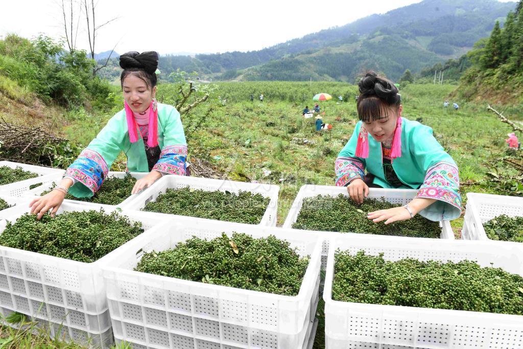 6月24日,在贵州省榕江县八开镇亚类村花椒种植基地,村民在整理采收的花椒。
