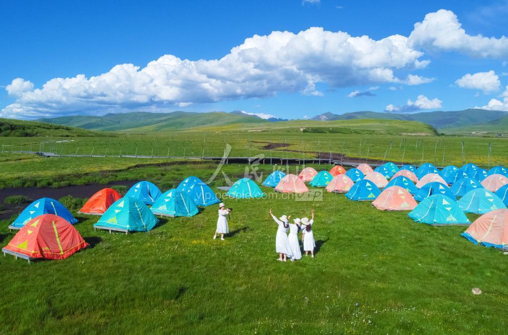 2022年6月29日,四川省阿坝州红原县俄么塘草原花海景区,游人露营其中,乐享夏日时光。