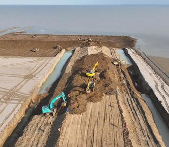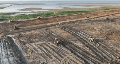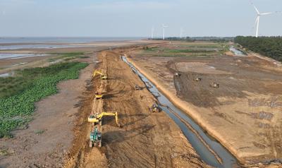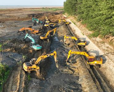 2022年7月1日下午,江苏省宿迁市泗洪县洪泽湖周边滞洪区近期建设工程施工现场,几十台挖掘机、推土机在清除堤防沿线淤泥,开挖土方,修筑围堰,整理取土区,为后续加固防洪堤、铺设防汛道路做准备,一派施工繁忙景象。 洪泽湖周边滞洪区近期建设工程是进一步治理淮河38项工程之一,泗洪县境内工程主要建设内容是加固堤防59.46公里,新建防汛道路100公里,建设泵站、涵闸等建筑72座。工程的实施将进一步完善洪泽湖沿线水利基础设施,提高湖泊防洪能力,筑牢防洪保安屏障。