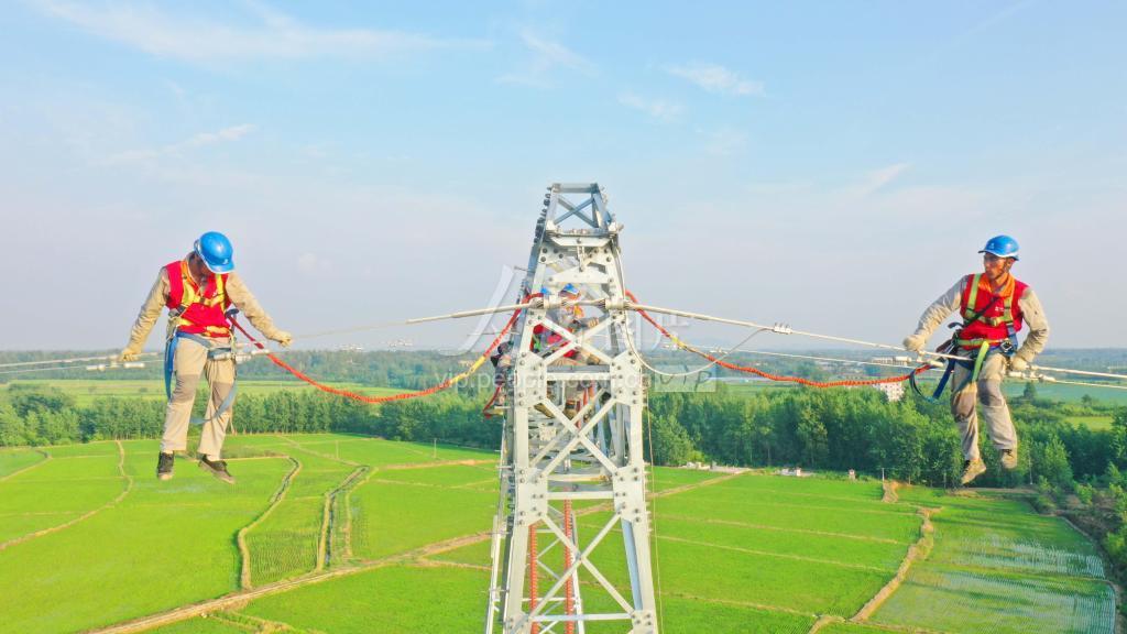 2022年7月4日,安徽省滁州市全椒县邱塘村境内,电力工人冒高温在60多米高空对架设220千伏八波输电线路。 连日来,安徽送变电工程有限公司和滁州供电公司120余名施工人员冒着高温天气,加紧对220千伏八波输电线路架线作业,确保今年9月底前建成投运,保障全椒县供电区域内居民生活和企业生产用电需求。据悉,滁州市220千伏全椒八波输变电项目为安徽省2022年重点工程。