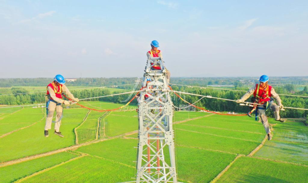 2022年7月4日,安徽省滁州市全椒县邱塘村境内,电力工人冒高温在60多米高空对架设220千伏八波输电线路。 连日来,安徽送变电工程有限公司和滁州供电公司120余名施工人员冒着高温天气,加紧对220千伏八波输电线路架线作业,确保今年9月底前建成投运,保障全椒县供电区域内居民生活和企业生产用电需求。据悉,滁州市220千伏全椒八波输变电项目为安徽省2022年重点工程。