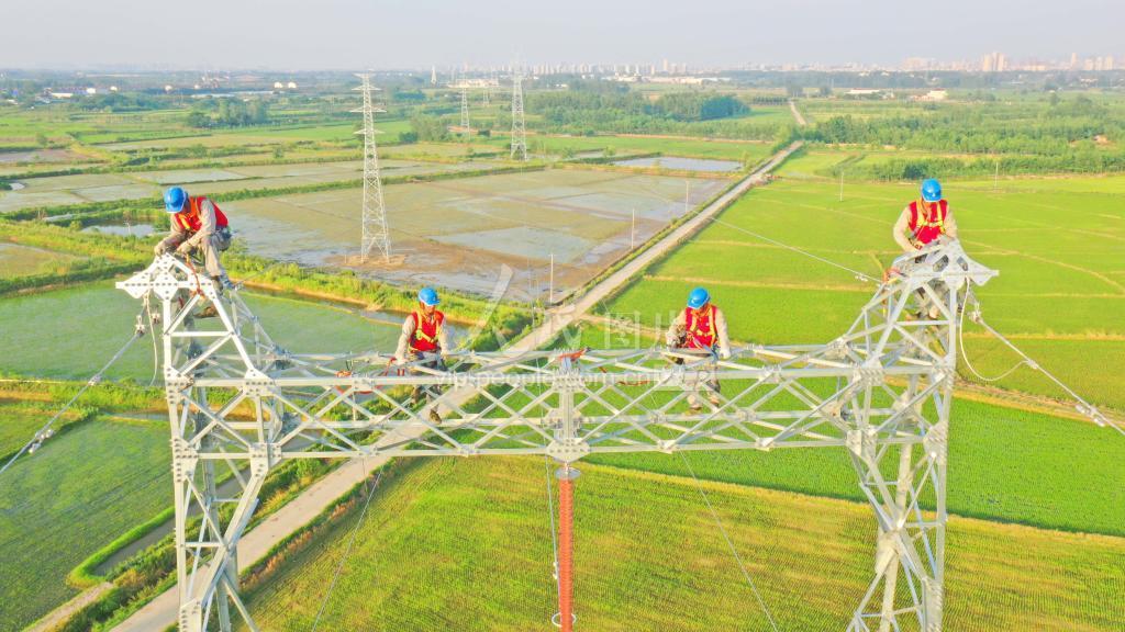 2022年7月4日,安徽省滁州市全椒县邱塘村境内,电力工人冒高温在60多米高空对架设220千伏八波输电线路。 连日来,安徽送变电工程有限公司和滁州供电公司120余名施工人员冒着高温天气,加紧对220千伏八波输电线路架线作业,确保今年9月底前建成投运,保障全椒县供电区域内居民生活和企业生产用电需求。据悉,滁州市220千伏全椒八波输变电项目为安徽省2022年重点工程。