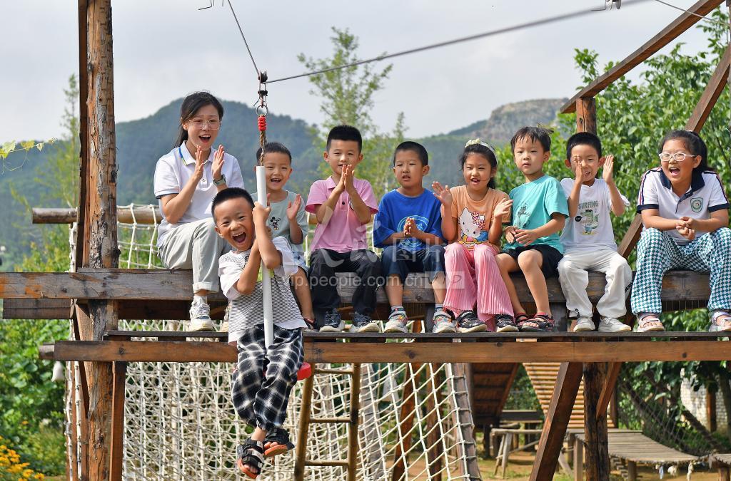 2022年7月11日,小朋友们在山东省烟台市福山区自然生活研学基地进行拓展训练。
