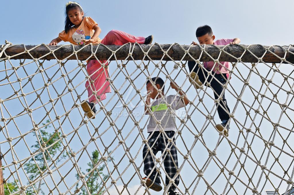 2022年7月11日,小朋友们在山东省烟台市福山区自然生活研学基地进行拓展训练。