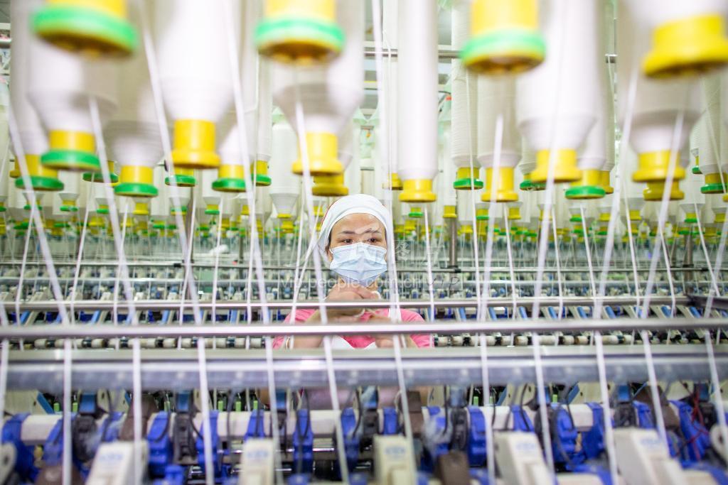 2022年7月15日,位于江苏省海安市南莫镇一纺织企业生产车间内,工人正在生产线上忙碌。