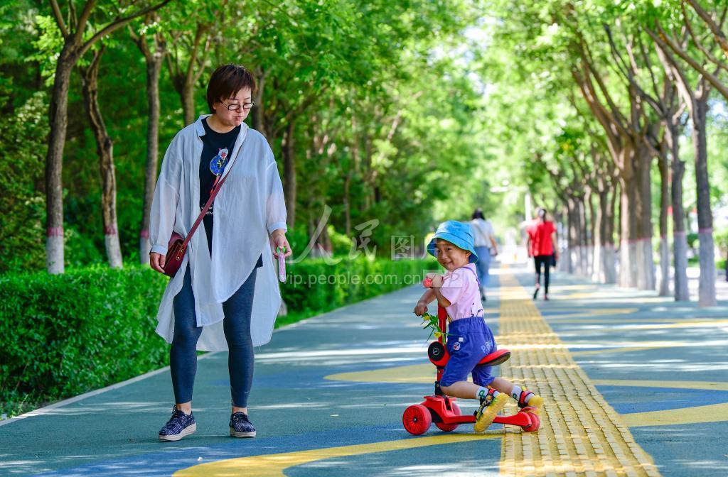 2022年7月17日,一对母子在呼和浩特市城市绿道上嬉戏。