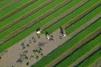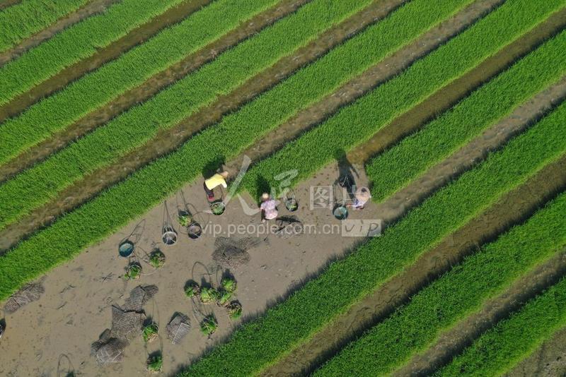 2022年7月17日,广西梧州市藤县藤州镇潭东村农民在田间拔取和搬运晚稻秧苗,秧畦、田野、阡陌相映成趣,宛如画卷。