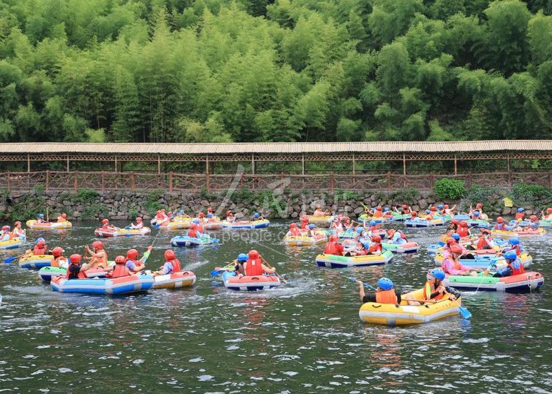 2022年7月25日,在浙江省湖州市安吉县昌硕街道石鹰村,游客们正在体验当地特色的漂流项目。