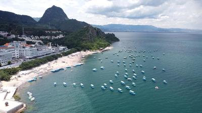 盛夏时节,位于云南省澄江市的抚仙湖,清澈的湖水与葱郁的青山,吸引众多游客到此游览,享受夏日清凉。