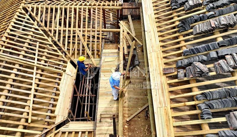 2022年7月29日,江西省赣州市赣县区白鹭乡白鹭古村,木匠和泥瓦匠在修缮古村的客家古建筑。 白鹭古村被评选为中国第四批国家历史文化名村,并入选第一批中国传统村落名录。近年来,江西省赣州市赣县区组织专业的古建筑修缮修复施工团队,对白鹭村近6万平方米的客家祠堂、骑楼等古建筑群进行抢救性修缮,加大保护力度,传承古建筑的历史文化价值,延续文化底蕴。