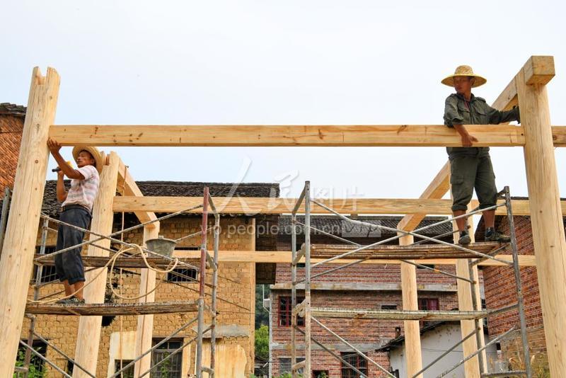 2022年7月29日,江西省赣州市赣县区白鹭乡白鹭古村,木匠和泥瓦匠在修缮古村的客家古建筑。 白鹭古村被评选为中国第四批国家历史文化名村,并入选第一批中国传统村落名录。近年来,江西省赣州市赣县区组织专业的古建筑修缮修复施工团队,对白鹭村近6万平方米的客家祠堂、骑楼等古建筑群进行抢救性修缮,加大保护力度,传承古建筑的历史文化价值,延续文化底蕴。