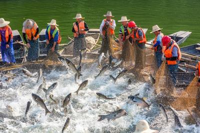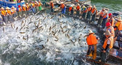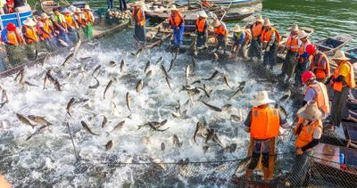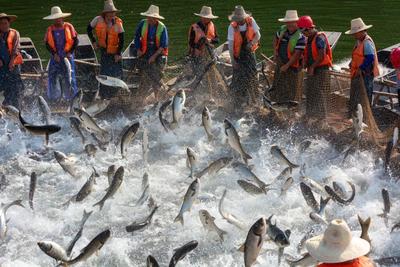 2022年7月28日,江西省新余市仙女湖的渔民们正在开展“巨网捕鱼”,湖面上呈现出“鱼跃人欢”的丰收景象。 仙女湖渔业资源丰富,盛产胖头鱼、鲤鱼、青鱼、鲢鱼等50多种鱼类,最大的鱼有上百斤重,每年有500多万斤有机鱼远销广东、浙江、江苏、上海、重庆等全国多个省市。