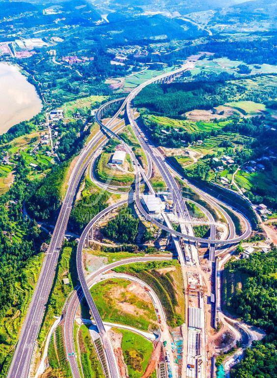 2022年7月28日,在四川省巴中市通江县境内,俯瞰巴万高速与镇广高速王坪至通江段交汇处广纳枢纽。