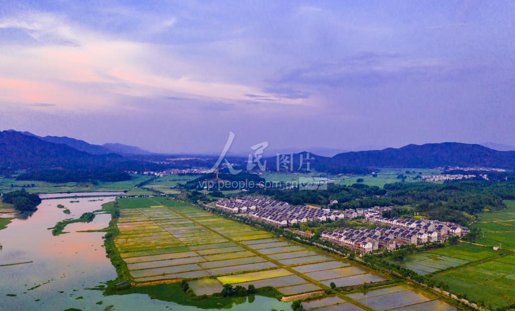 2022年8月2日,俯瞰江西省吉安市吉水县八都镇中村移民新村,田园、河流、民居在晚霞的映衬下,构成一幅美丽宜居的乡村画卷。