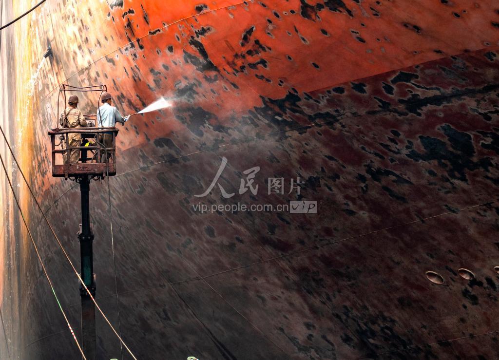 2022年8月4日,繁忙的船坞,修船工为船舶清洁。