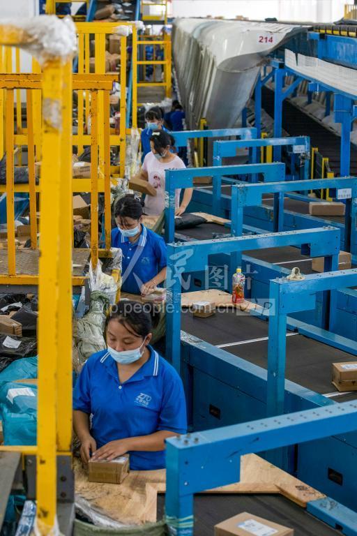 2022年8月4日,位于广西岑溪市马路镇的中通快递桂东(岑溪)智能科技电商产业园分拣车间,工人正在调度分拣快递件。