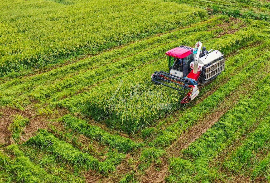 2022年8月5日,村民驾驶收割机在贵州省黔东南苗族侗族自治州岑巩县水尾镇新场村收割制种水稻。