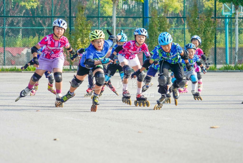 2022年8月6日,河北省遵化市轮滑爱好者在进行轮滑训练,为“全民健身日”表演做准备。