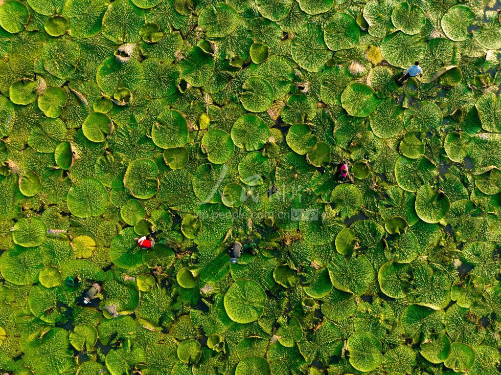 2022年8月6日,江苏省淮安市淮安区车桥镇受河村一芡实种植基地里,芡实长势喜人,农民们正在加紧采摘芡实。