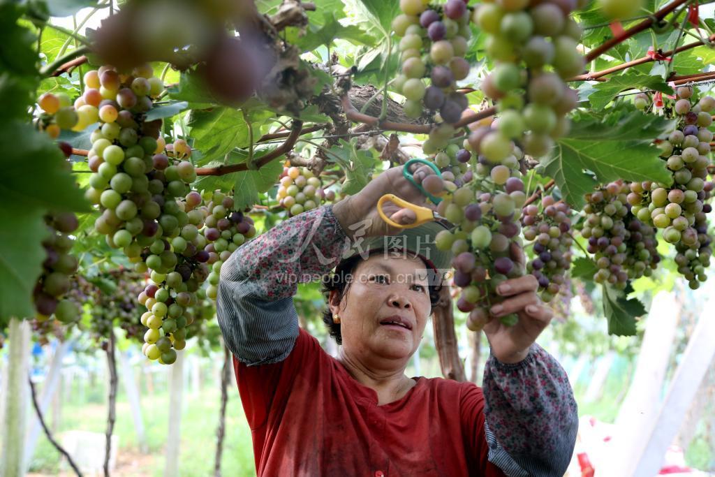 上传时间: 2022-08-06 10:31:05 图片说明: 2022年8月6日,在江苏省连云港市朝阳街道刘巷韩李村,农民在葡萄园中管护葡萄。