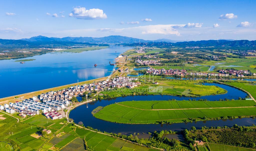 2022年8月9日,江西省吉安市吉水县赣江西畔同江流域,一河碧水与错落有致的民居、两岸稻田交相辉映,在蓝天白云下呈现出一幅欣欣向荣的乡村生态画卷。