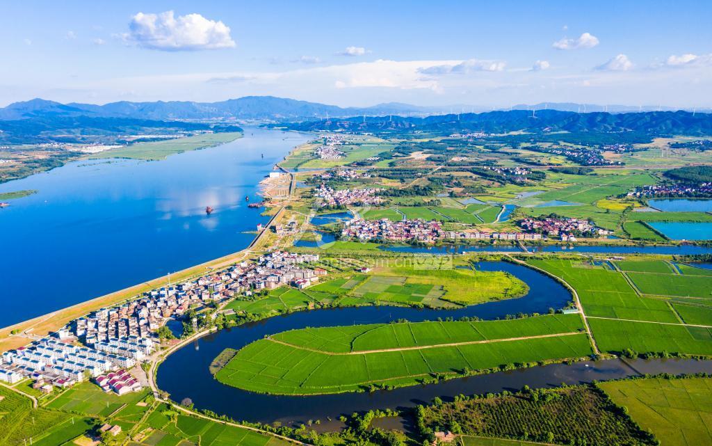 2022年8月9日,江西省吉安市吉水县赣江西畔同江流域,一河碧水与错落有致的民居、两岸稻田交相辉映,在蓝天白云下呈现出一幅欣欣向荣的乡村生态画卷。